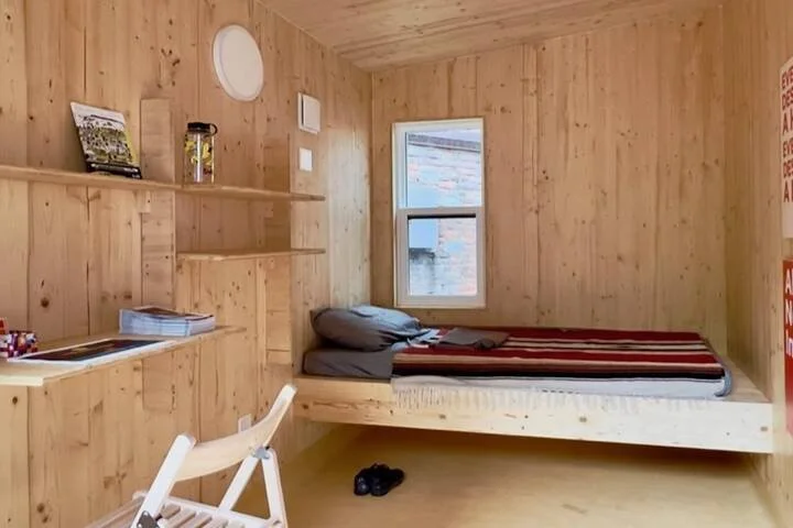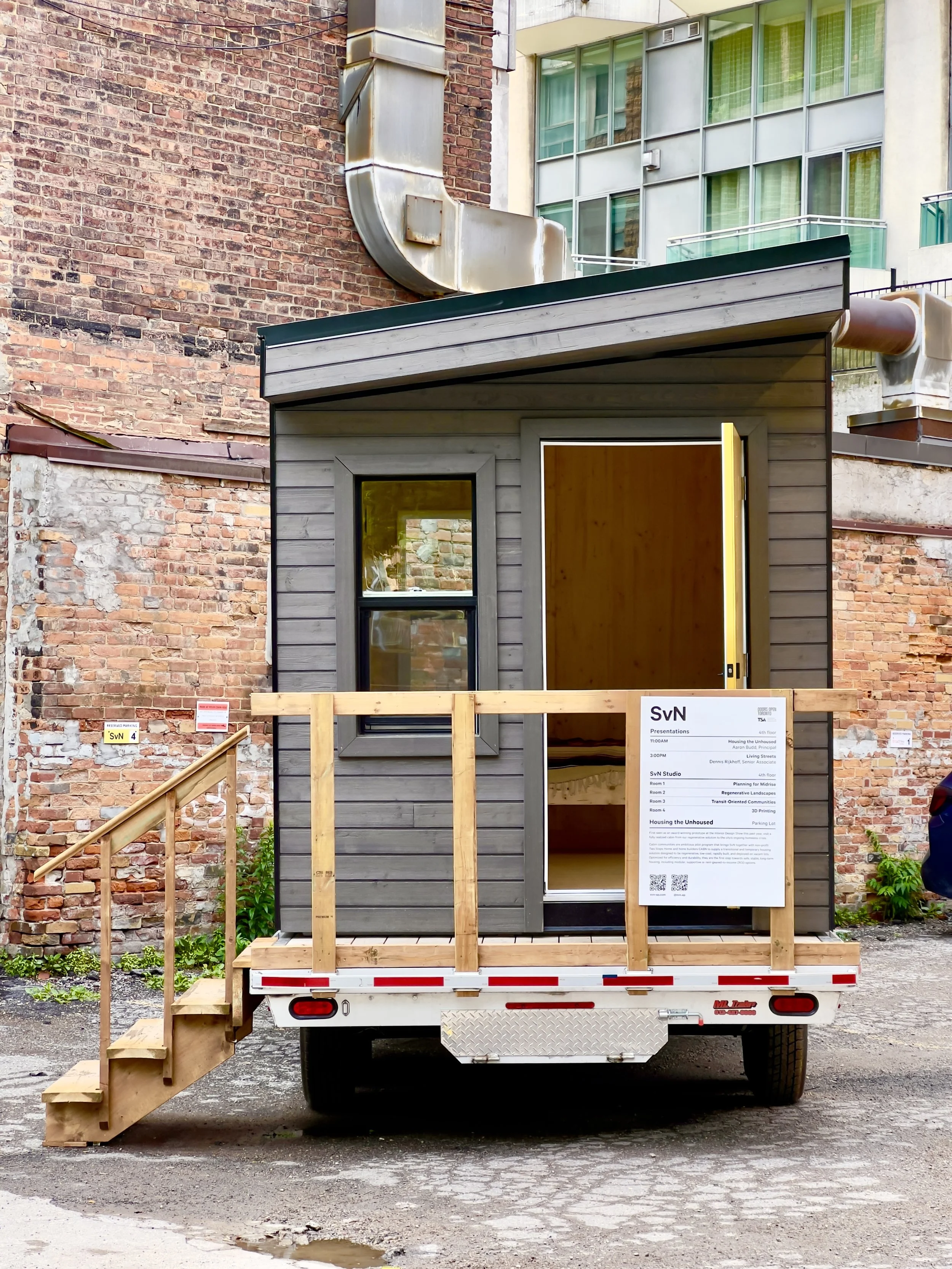 Two Steps Home and SvN Architects debuted our prototype cabin design for Toronto’s Doors Open 2024 at 110 Adelaide St E. The cabin is built on a trailer as a showpiece, to be shown around the city.